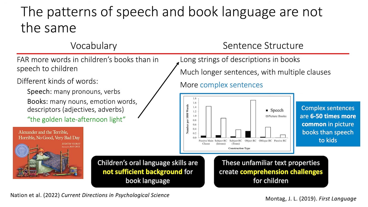 In studies, complex sentences are 6-50 times than in the speech to kids. Kids could go a week and never hear some of these structures and yet encounter them four times in a book that somebody is reading to them.”