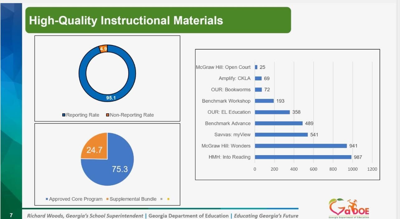 Curriculum reform was a key pillar of Georgia’s 2023 Early Literacy Act (which also introduced teacher preparation audits, screening, and teacher training). The legislation required the Georgia Department of Education (GDOE) to vet elementary reading curricula and create a list of high-quality options. Then, districts were required to select a program off the list or secure state approval for the “supplemental bundle” used in schools.