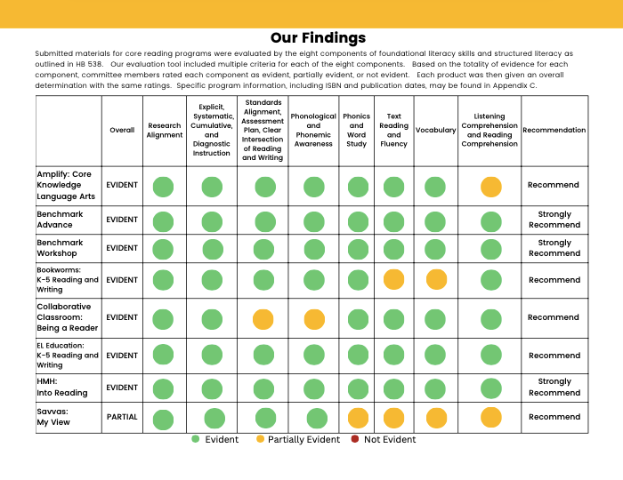 Many in the field groaned. The committee hadn’t screened for knowledge-building or text complexity, and it showed. The “strongly recommended” options were basals from big publishers that fell short on text quality/complexity and knowledge-building. Strangely, EL Education was the only program to receive all-green evaluations but no “Strongly Recommend.” (EL Education was developed by a nonprofit and it’s distributed by another nonprofit, Open Up Resources. Neither has the resources to send lobbyists to state houses, which might be the culprit.)