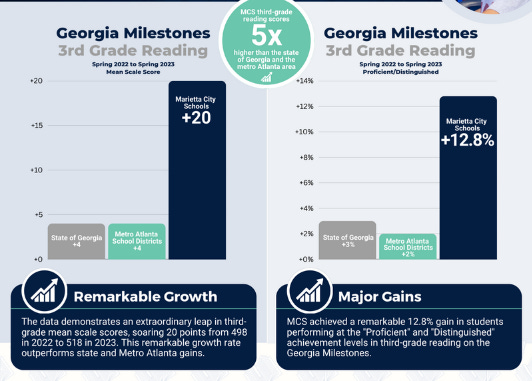 Georgia has positive stories in districts that selected strong materials. In Marietta City Schools, investments in structured literacy have paid off. Marietta invested in well-trained reading specialists in 2021, and by 2023, it was outpacing the state in reading gains by a factor of 5. Unsurprisingly, Marietta made excellent curriculum choices, adopting Wit & Wisdom in 2024, paired with UFLI for foundational skills. The smart curriculum selections are part of a broader effort: Marietta provides intervention during the school day for underperforming students and it has piloted after-school tutoring for struggling third graders. Its “success spans across all demographics. Black, disabled and economically disadvantaged students all saw double-digit gains in proficient literacy rates.” You love to see it.