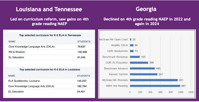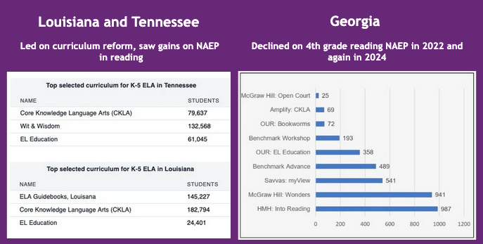 The curriculum used in Georgia have little in common with the curricula in Louisiana and Tennessee, the two states with surging reading outcomes. That matters – a lot.