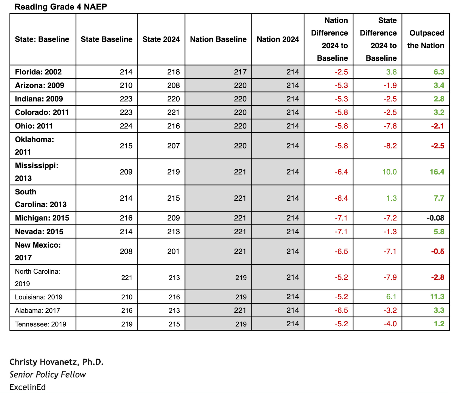 My argument is that implementation is the real leverage point, not policy. Good implementation takes leadership. I see a compelling case that Mississippi, Louisiana, Tennessee, Alabama, and Florida went through chapters when strong leaders truly leaned into strong implementation, and outcomes rose because of well-executed reforms.