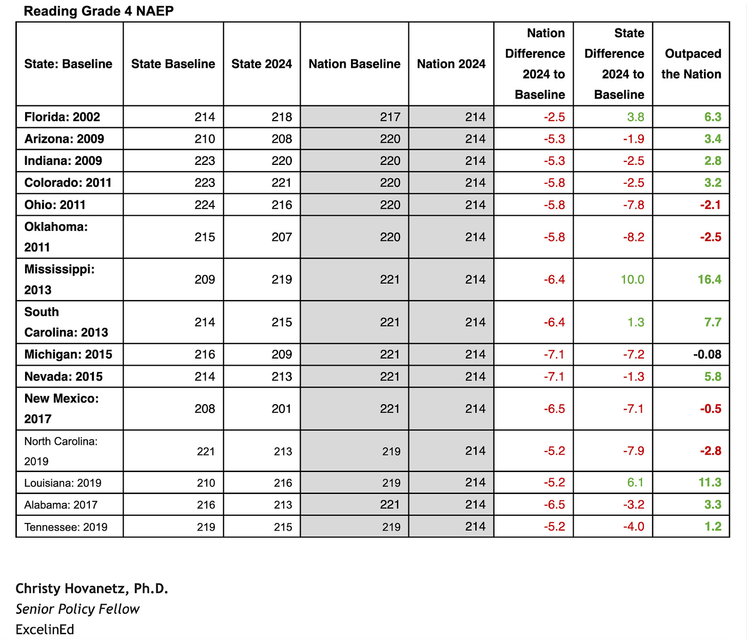 Of the 15 states that adopted most of the 18 policies by 2019, 10 of them outpaced the national average in fourth-grade NAEP reading scores by 2024… but test scores in four of the 15 states declined more than the nation’s did, and Michigan tied, showing the difficulty of implementing the reforms.”