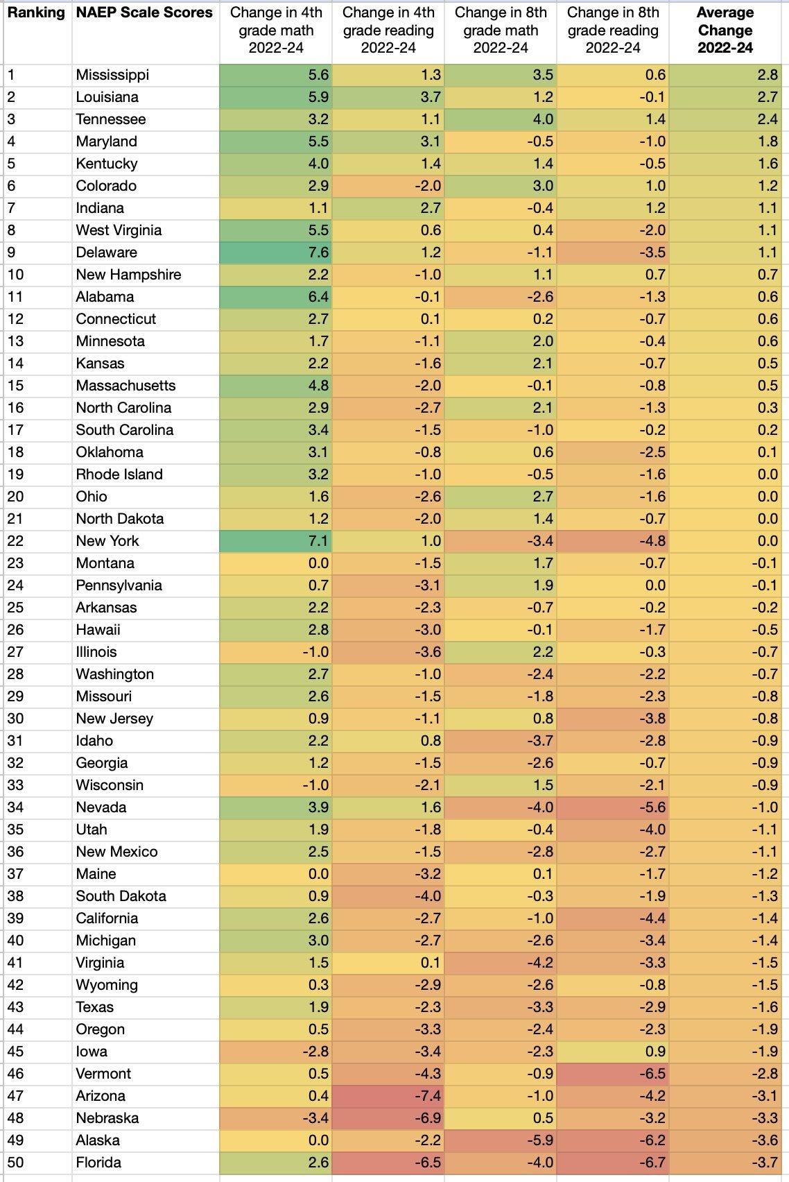 Then there’s Florida. It went through a phase with strong leadership and reform efforts, and gains followed. But in recent years, Florida has been the fastest-declining state in the nation overall2, with a meaningful drop in reading: